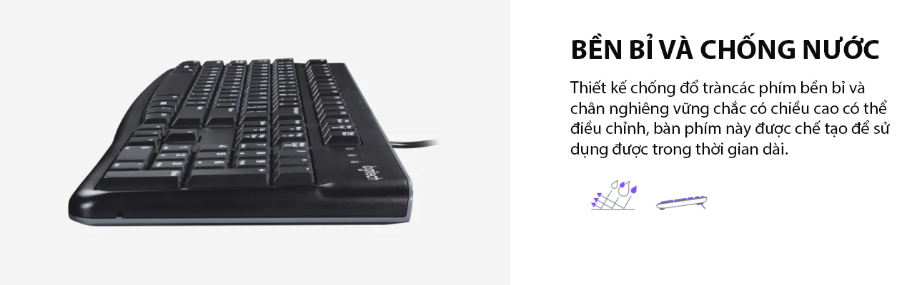 Thiết kế chống đổ tràn2Được kiểm nghiệm trong điều kiện giới hạn (tối đa 60 ml chất lỏng đổ tràn). Không được nhúng bàn phím vào chất lỏng., các phím bền bỉ và chân nghiêng vững chắc có chiều cao có thể điều chỉnh, bàn phím này được chế tạo để sử dụng được trong thời gian dài.